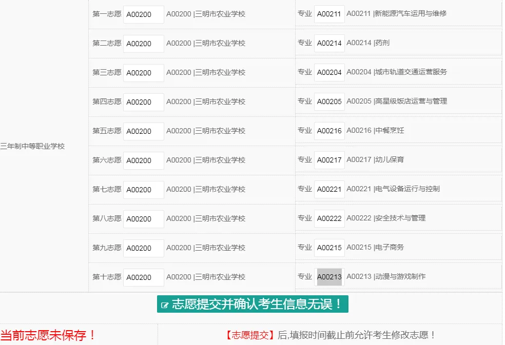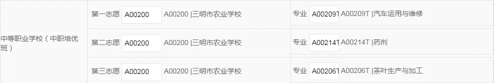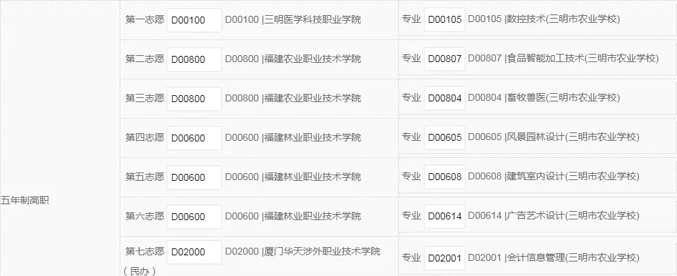 3.若想最大几率被三明农校录取,第1志愿要填报我校专业志愿。在常规志愿批次,如五年制大专、中专批次建议1-5志愿尽量都填报我校专业志愿(越喜欢的专业填报时越要靠前),填的志愿越多,录取机会越大。