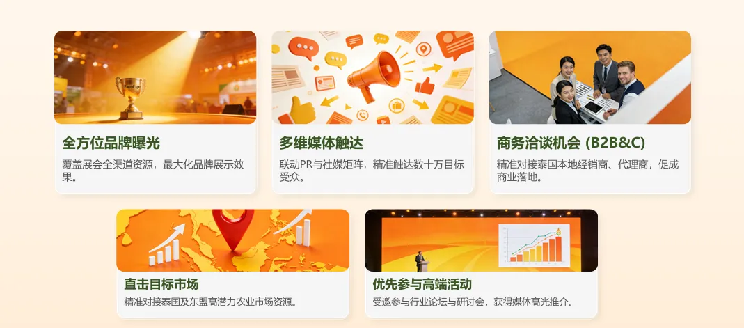 依托主办方资源,为企业对接泰国农业部、行业协会、头部采购商及渠道商;提供市场准入、BOI政策咨询、法务财税、清关物流等本地化支持。