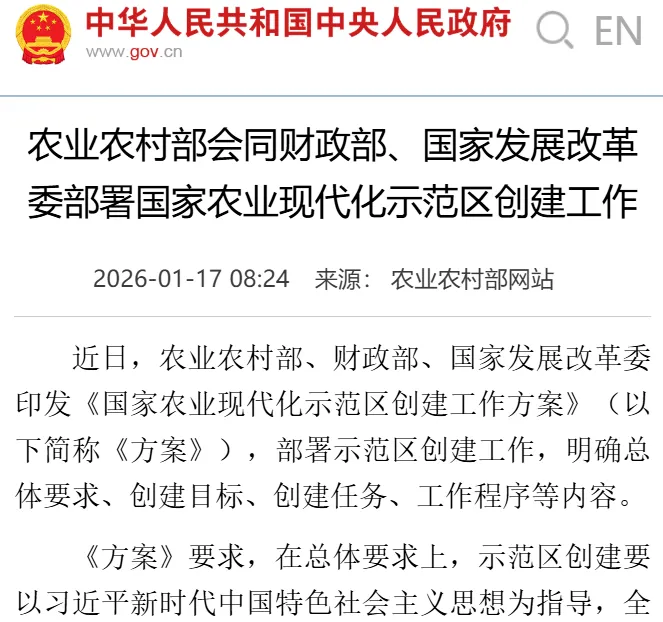2026年1月,农业农村部、财政部、国家发展改革委于联合印发的《国家农业现代化示范区创建工作方案》(以下简称:《方案》)。该方案是农业强国战略的关键部署,明确提出到 2030年 累计创建不超过 500个 示范区,重点建设粮食产业、养殖业、优势特色产业、智慧农业、都市农业、旱作农业六类示范区。早在2009年11月原农业部印发《关于创建国家现代农业示范区的意见》,首次系统提出示范区创建的意义、指导思想、基本原则与目标。2021年,农业农村部、财政部、国家发改委印发《农业现代化示范区创建工作的通知》,公布2021年农业现代化示范区创建名单,开始以县为单位开展示范区创建。2022年,还是农业农村部联合财政部、国家发改委三部委印发《关于开展2022年农业现代化示范区创建工作的通知》聚焦粮食产业,优势特色产业发展,首次提出了阶段目标“分区分类创建100个左右示范区”。2026年1月,农业农村部、财政部、国家发改委联合印发本方案,进一步明确部署六类示范区创建,提出明确目标“到2030年,创建不超过500个”。同时方案设计上也呈现多个创新: 首先是针对不同区域,不同产业设计的六类示范区,实行差异化指导。 符合我国不同区域农业产业发展基础差异大的基本国情,能够因地制宜的鼓励地方探索农业现代化差异化路径。 其次是设置“常规任务+专项任务”的组合, 既能体现示范区创建服务农业强国战略的共性要求,又能结合不同示范区特点体现了特色性。接下来,笔者结合自身研究领域(县域特色农业产业培育)重点解读第三类优势特色产业示范区创建任务与要求。优势特色产业示范区 总体要求 是发挥 区域比较优势 。什么是区域比较优势?笔者认为在农产品同质化严重的今天,特色农业产业的比较优势就是把自家“人无我有”的优势发挥到极致,形成别人不可替代的竞争力。- 深耕特色资源: 重点发展本地最稀缺,最优质的特色农产品产业;