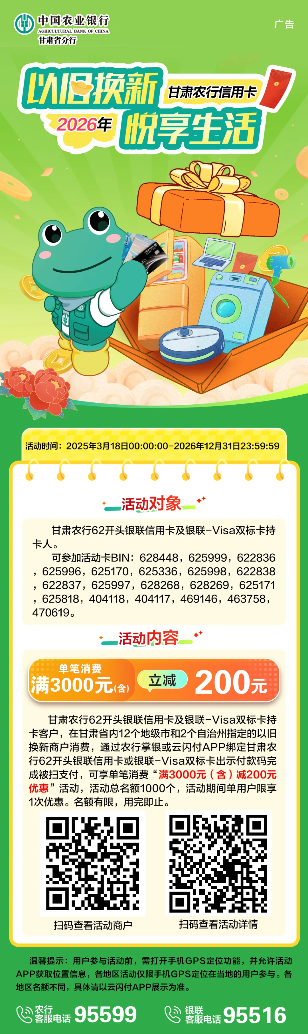 以旧换新丨甘肃农行信用卡2026年悦享生活