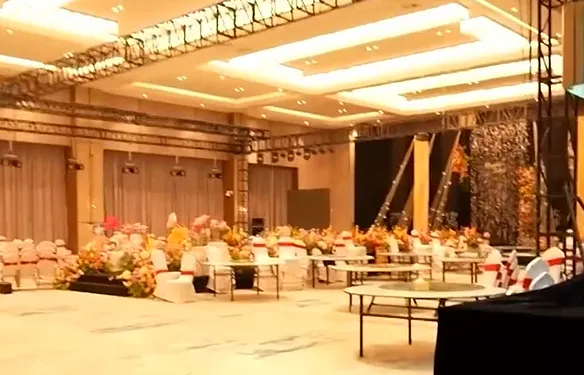 在园区的核心建筑上,“求是楼”“求真楼”“迎宾楼”“宴宾楼”等标识硕大而清晰。跟侧门边上这块不起眼的牌子,形成了鲜明对比。在宴宾楼里,记者注意到还有这样的大包间,可以容纳20多人同时就餐。