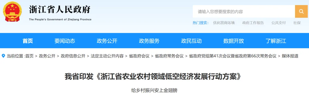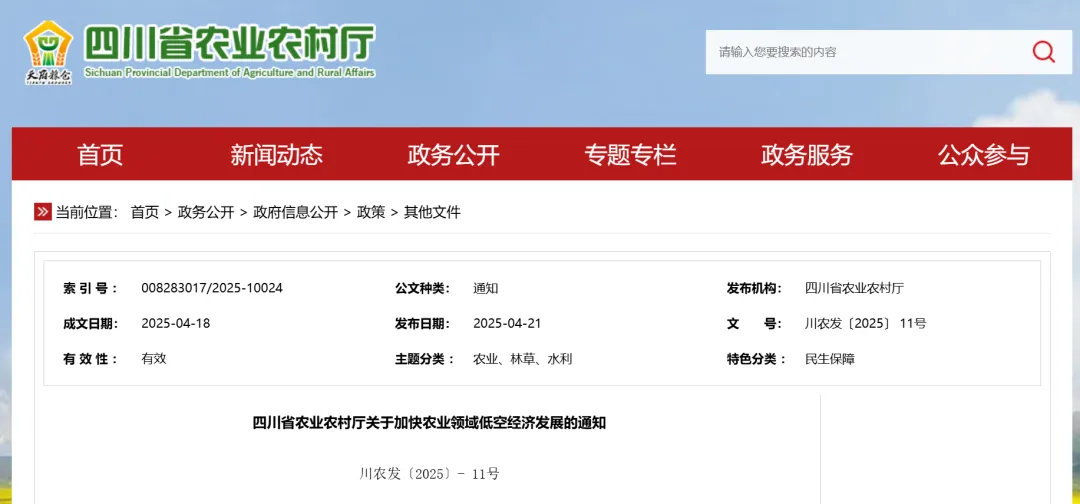 在中央政策指引下,地方迅速行动。目前,浙江、四川、江西、江苏已出台农业农村低空经济专项政策,福建发布相关政策征求意见稿,形成了中央定调、地方先行的推进格局。