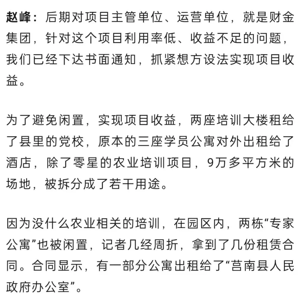 莒南县,是山东省临沂市一个以农业为主的县。在县城北部,一片占地近140亩、总建筑面积超过9万平方米的建筑群格外醒目。根据官方的文件,这里是“莒南县现代农业公共实训基地建设项目”,总投资超过7亿元。全力打造集农业品种、技术、服务于一体的实训基地。然而,当记者走进这片园区,看到的景象却与“农业实训”相去甚远。