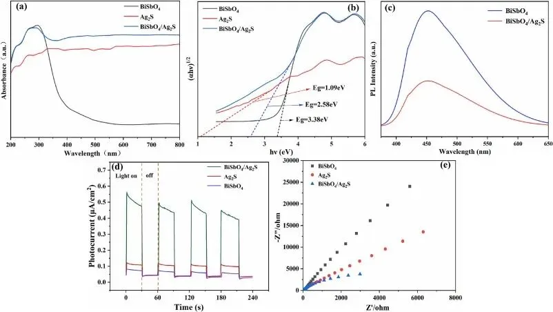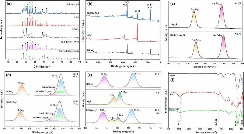 准备BiSbO4/农业2S复合光催化剂,1克制备的BiSbO4先在30毫升蒸馏水中分散,随后加入1.289克AgNO3磁搅拌1小时。随后,0.9115克Na2溶解在20毫升蒸馏水中的S滴入BiSbO中4暂停并反应了4小时。在此过程中,农业2S是在BiSbO表面生长的4.这些产品被收集后,用蒸馏水和无水乙醇清洗三次,并在60°C下干燥6小时。获得的BiSbO4/农业2S材料的摩尔比为Bi3+至1:3的Ag。本文用于测试光催化性能的复合材料均在此比例下制备。复合材料通过改变AgNO剂量,以5:1、3:1、1:1和1:5的摩尔比制备+3以及Na2S用于后续检测。