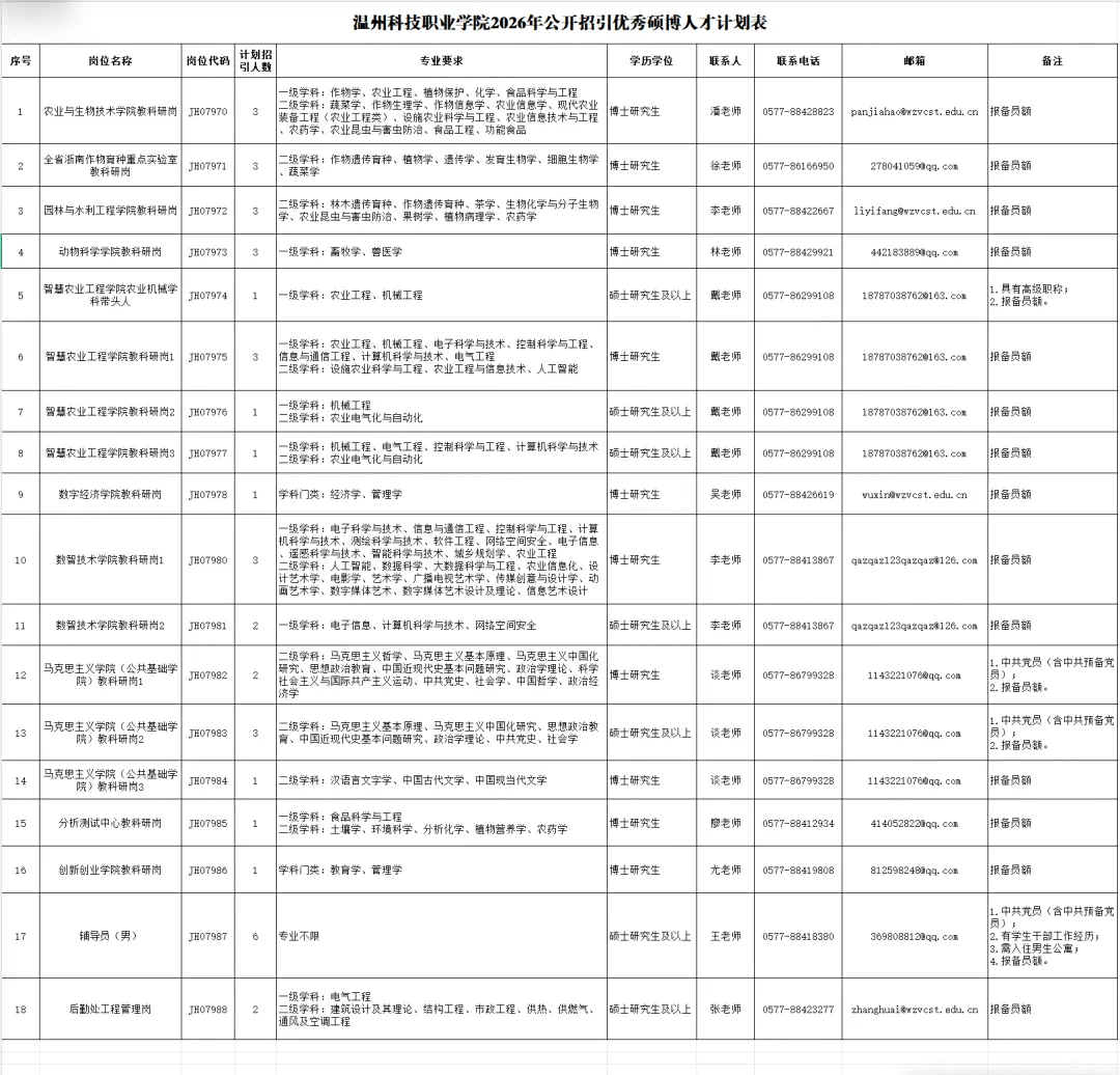 (1)岗位及专业信息可联系《温州科技职业学院2026年优秀硕博人才招引岗位需求表》中的对应联系人。