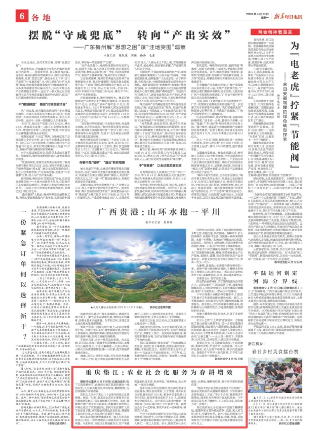 4月13日,新华每日电讯第6版刊发《重庆垫江:农业社会化服务为春耕增效》稿件,报道垫江聚焦春耕生产,通过培育社会化服务组织、整合农机人才资源、搭建便民服务平台等方式,有效破解 “谁来种地、怎么种地” 难题,推动粮油及特色产业提质增效、助力乡村振兴的生动实践。详见链接~