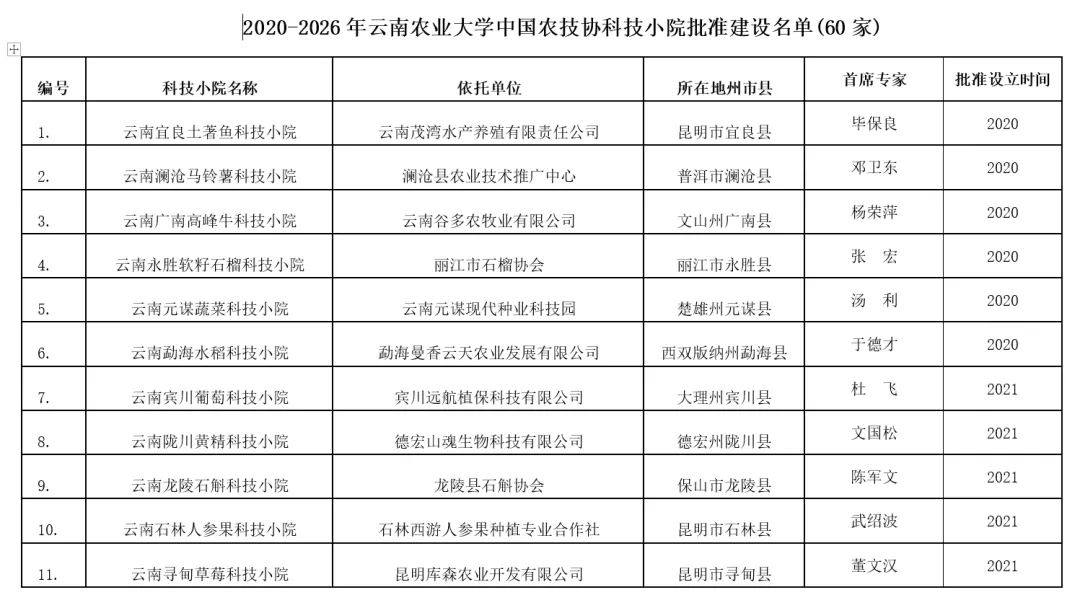 自2000年以来,在中国农技协的指导、云南省科协和云南农业大学的推动下,中国农技协科技小院在人才培养、科学研究和农业科技社会服务中取得显著实效,在服务农业增效、农民增收和高原特色农业发展,有效推动巩固拓展脱贫攻坚成果同乡村振兴有效衔接方面发挥了重要作用。从2020年至2026年的六年间,云南省共分7批获得中国农技协科技小院105个,其中云南农业大学60个(附件1-10,科技小院名单文件汇总)。