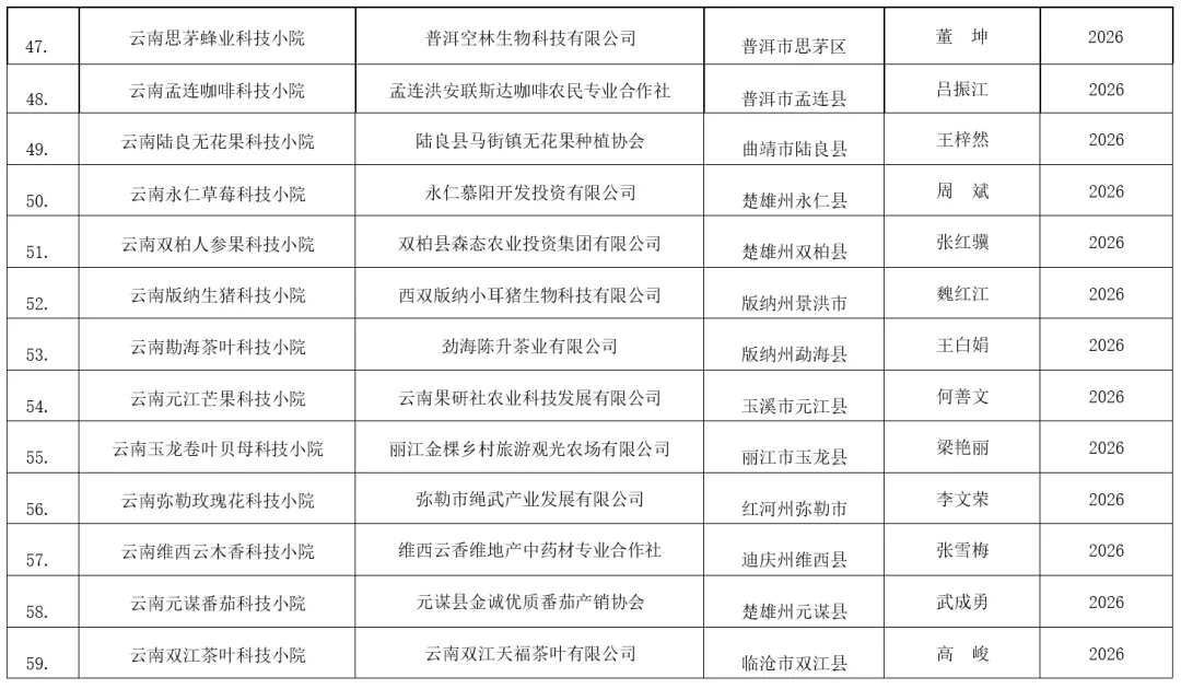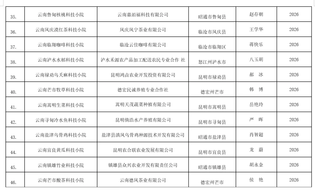 2026年4月1日,中国农村专业技术协会回函云南省农村专业技术协会《关于同意设立“中国农村专业技术协会科技小院”的批复》({2026}12号),2026年云南省获批69个(详见附件9)。在69个科技小院中,由云南农业大学专家牵头建设的科技小院29个,由其他机构联合云南农业大学共建的3个。29个科技小院的首席专家是云南农业大学马春花、朱映安、王坤、赵存朝、王学华、蒋快乐、八玉胡、郝冰、韩博、岳艳玲、严晖、肖智超、龙蔚、胡永金、侯艳、董坤、吕振江、王梓然、周斌、张红骥、魏红江、王白娟、何善文、梁艳丽、李文荣、张雪梅、武成勇、高峻、严玉霖。