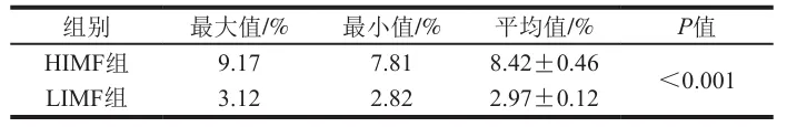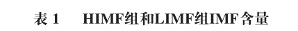 基于165 个样本IMF含量测定结果,获得了165 个连续分布的原始数据。对165 个IMF数据进行正态性检验,确认数据符合正态分布。基于该数据分布特征设定分组阈值,高肌内脂肪(HIMF)组:IMF含量≥均值+1 倍标准差。低肌内脂肪(LIMF)组:IMF含量≤均值-1 倍标准差。初步筛选后,HIMF组符合阈值的样本共20 个,LIMF组符合阈值的样本共19 个。按“组内标准差最小化”原则从两组中各选取6 个样本。统计分析显示,两组间T检验得到的P值小于0.001,差异高度显著(表1)。