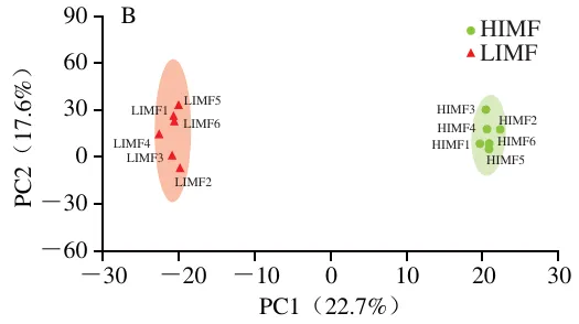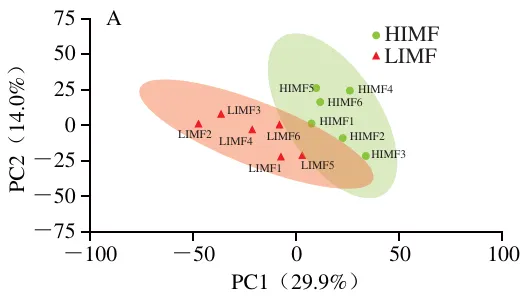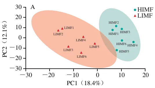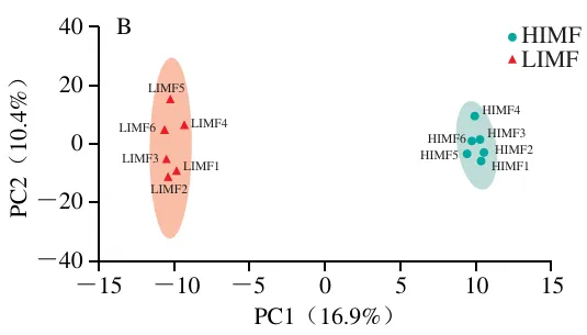 基于无监督模式识别的多元统计分析技术,本研究采用方差归一化处理的PCA模型对HIMF组和LIMF组进行质量控制评估。结果显示,两组样本的代谢轮廓在PC1(18.4%)与PC2(12.1%)构成的二维空间内呈现明显聚类分离特征(图4A)。为增强组间差异解析能力,进一步构建了基于正交信号校正的监督式OPLS-DA模型。OPLS-DA模型( RX2=0.273,RY2=0.998,Q2=0.732)显示,两组间的分离状况良好,表明该模型具备理想的分类可靠性及抗过拟合特性(图4B)。