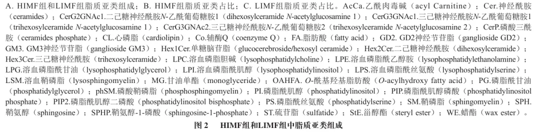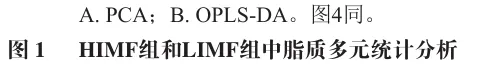 采用均值中心化的无监督PCA模型对HIMF组和LIMF组进行质控分析。结果表明,两组的脂质提取物在数据集中被PC1(29.9%)和PC1(14.0%)明显区分(图1A)。OPLS-DA作为一种集成监督模式识别的多元统计分析方法,旨在消除背景噪声和组内误差干扰的影响,最大化组间差异。OPLS-DA模型( RX2=0.834,RY2=0.862,Q2=0.488)显示,两组间的分离状况良好,表明该模型具有较好的诠释和预测能力,实验数据具有良好的重复性(图1B)。