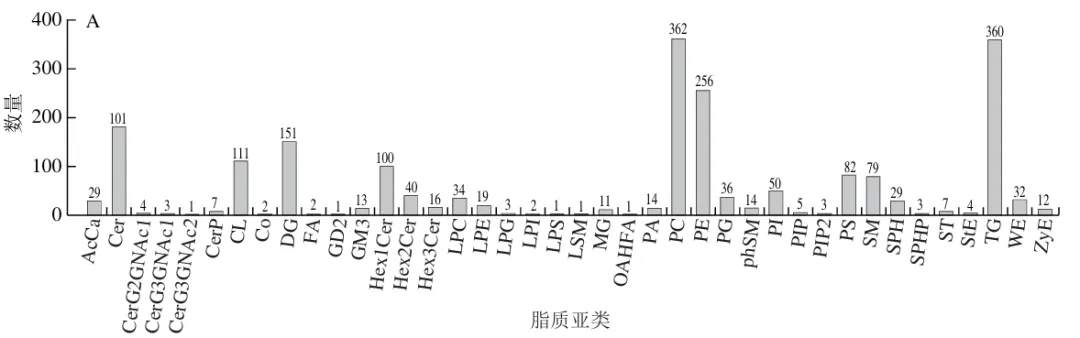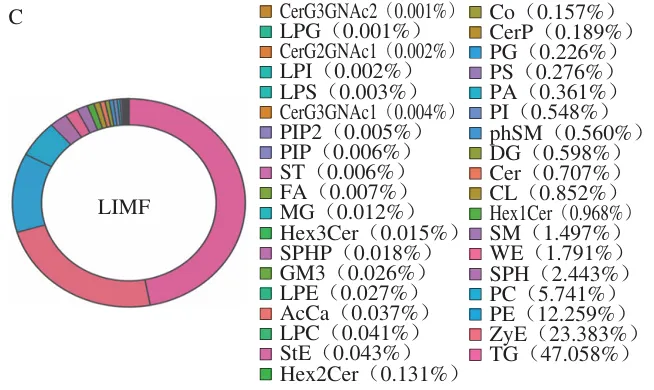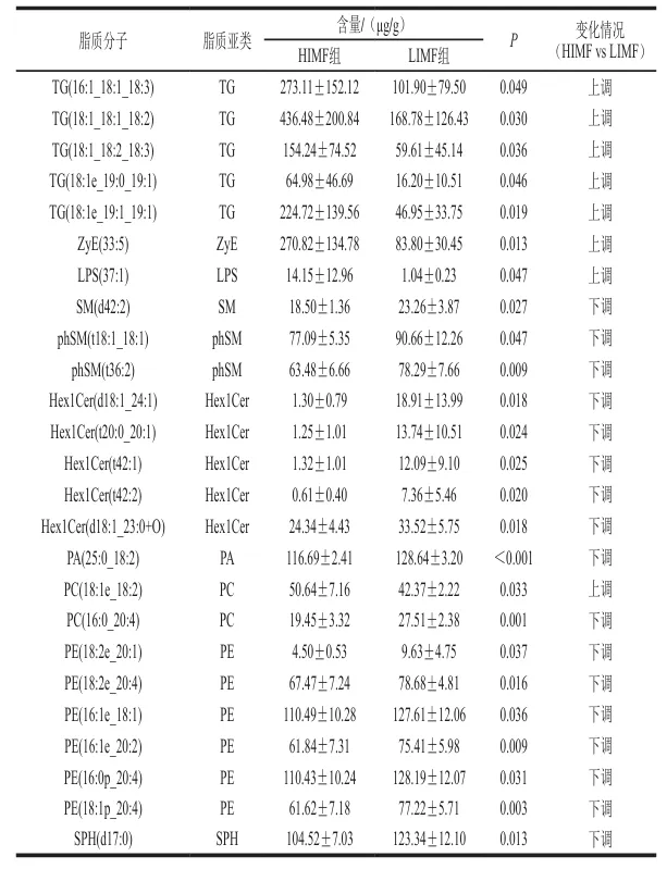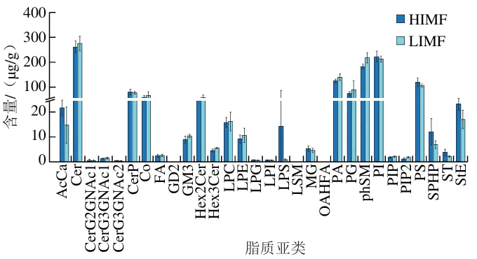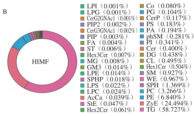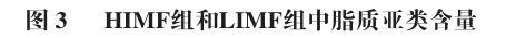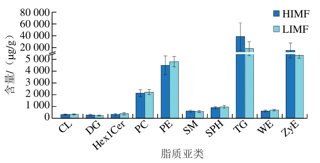 HIMF组和LIMF组在正离子和负离子模式下共鉴定出2 081 种脂质分子,归类为甘油三酯(TG)、甘油二酯(DG)、磷脂酰胆碱(PC)、磷脂酰乙醇胺(PE)、酵母甾醇(ZyE)和磷脂酸(PA)等40 个脂质亚类(图2A)。HIMF组中主要的脂质成分为TG(58.727%)、ZyE(24.494%)、PE(6.84%)、PC(3.266%),LIMF组中主要的脂质成分为TG(47.058%)、ZyE(23.383%)、PE(12.259%)、PC(5.741%)(图2B、C)。HIMF组和LIMF组中TG的含量分别为38 448.36 μg/g和18 363.69 μg/g,DG的含量分别为286.54 μg/g和233.50 μg/g,ZyE的含量分别为16 036.46 μg/g和9 124.92 μg/g,PC的含量分别为2 138.32 μg/g和2 240.35 μg/g,PE的含量分别为4 477.94 μg/g和4 784.13 μg/g(图3)。