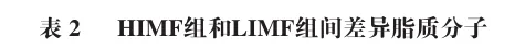 为进一步揭示HIMF组与LIMF组间脂质分子的差异特征,本实验以变量投影重要性(VIP)>1和P<0.05为差异脂质分子筛选标准。如表2所示,共筛选出6 种TG、6 种PE和5 种Hex1Cer等25 种差异脂质分子(上调8 种,下调17 种)。TG类脂质(如TG(16:1_18:1_18:3)、TG(18:1_18:1_18:2)、TG(18:1_18:2_18:3)等)在HIMF组中显著上调,而PA(25:0_18:2)、PC(16:0_20:4)、PE(18:2e_20:1)、PE(18:2e_20:4)、PE(16:1e_18:1)等磷脂类脂质在HIMF组中大多呈现显著下调趋势。HIMF组中TG(16:1_18:1_18:3)、TG(18:1_18:1_18:2)等5 种TG含量显著高于LIMF组。这类TG富含的不饱和脂肪酸链(如18:1、18:2、18:3)是加热过程中脂肪氧化生成酯类、醛类物质的核心前体,其高含量为HIMF组特征风味物质的生成提供了物质基础。