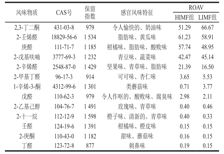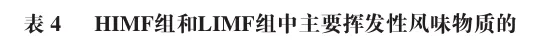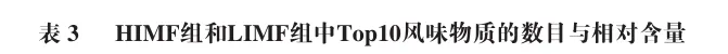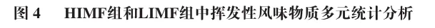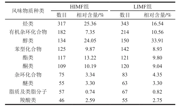 利用GC×GC-TOF MS技术对常压下沸点在50~260 ℃间的各种挥发性物质进行检测,在HIMF组和LIMF组中分别鉴定出1 649 种和1 842 种带有CAS号注释的风味物质。采用PubChem数据库及Classyfire软件对检测风味物质进行种类注释分析,并分析各种类对应风味物质的数目和相对含量。将所鉴定风味物质分为烃类、有机杂环化合物、醇类、苯型化合物、酯类、酮类、杂环化合物、醚类、脂质及类脂分子和羧酸类(风味物质数目排名前10的种类)。HIMF组和LIMF组的风味物质在种类数目和相对含量上呈现出显著差异。在风味物质种类方面,LIMF组在多数种类中的风味物质数目均多于HIMF组,例如烃类、有机杂环化合物、醇类、苯型化合物、酯类、酮类等。然而在相对含量方面,HIMF组的烃类和酯类相对含量较LIMF组分别高53.33%和34.90%,而LIMF组的醇类和有机杂环化合物相对含量较HIMF组高41.00%和43.67%(表3)。结果表明,HIMF组和LIMF组在风味物质组成上存在差异。Zhang Yingying等基于多组学分析研究岔路黑猪4 个部位(背最长肌、斜方肌、腘绳肌和腹胁肉)之间的风味差异,结果显示腘绳肌中大部分风味物质种类的数目均多于其他部位,腘绳肌中风味物质含量丰富且组成复杂。本研究中LIMF组在多数风味物质种类的数目上多于HIMF组,这意味着LIMF组具有更丰富的风味物质组成,可表现出更强的风味多样性和复杂性。在相对含量方面,HIMF组烃类和酯类的相对含量显著高于LIMF组,而醇类和有机杂环化合物的相对含量显著低于LIMF组,表明两组在风味物质的积累和代谢路径上存在差异。