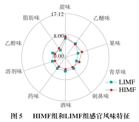 此外,利用FlavorDB数据库分析两组样品中挥发性风味物质的感官特征。如图5所示,HIMF组和LIMF组表现出不同的风味特征。HIMF组表现出较强的甜味、果味、青草味和脂肪味。而LIMF组表现出较强的乙醚味、刺鼻味、酒味、药味、溶剂味和乙醇味,表明两组在风味特征上存在显著差异,推测IMF含量与这些愉悦风味特征呈正相关。Wang Qian等的研究结论进一步支持了这一观点,研究发现与IMF含量为6.28%伯克夏猪相比,IMF含量分别为10.90%和9.06%的宁乡猪和伯宁猪(伯克夏猪×宁乡猪)具有更强烈的甜味、果味和花味等风味特征。
