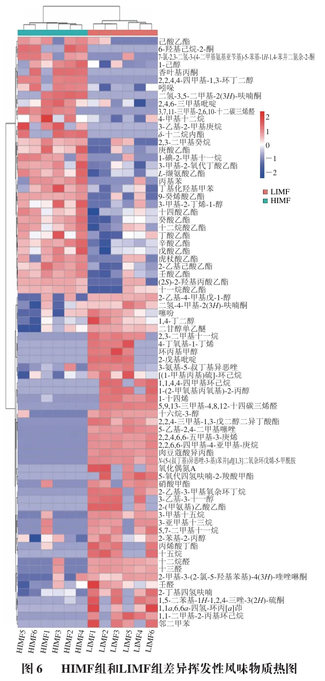 为进一步探究HIMF组和LIMF组间的差异挥发性风味物质,以P<0.05、VIP≥1标准筛选差异风味物质。如图6所示,两组中共鉴定出76 种差异挥发性风味物质(上调33 种,下调43 种),包括酯类19 种、有机杂环化合物15 种、烃类13 种、醇类10 种、苯环型化合物5 种、醛类4 种、醚类3 种、酮类2 种、脂质和类脂分子2 种、羧酸及衍生物1 种、萜类1 种、有机卤素化合物1 种。HIMF组中特征性上调风味物质以酯类为主,包括丁酸乙酯、己酸乙酯等,这类物质多贡献果香味,是HIMF组风味更浓郁的主要来源。LIMF组中特征性上调风味物质以烃类、醇类、醛类为主,这些物质多数带有脂肪味,如3-十六烷醇、1-十四烯、十三醛、3-亚甲基十三烷、十五烷等。