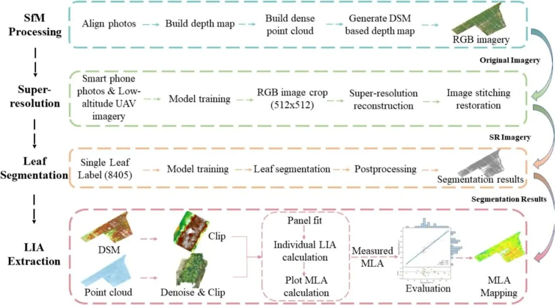 该框架集成了三个关键步骤:首先,利用基于深度学习的超分辨率方法,将正射影像分辨率提升至0.28 cm/pixel;其次,采用基于U-Net的语义分割模型实现单叶的精确分割(准确率为0.93,F1值为0.84,召回率为0.84,精确率为0.85);最后,提出两种叶片倾角提取方法,即基于点云的LIA_PC方法和基于数字表面模型(Digital Surface Model, DSM)的LIA_DSM方法,两者均采用随机采样一致性(Random Sample Consensus, RANSAC)进行平面拟合。