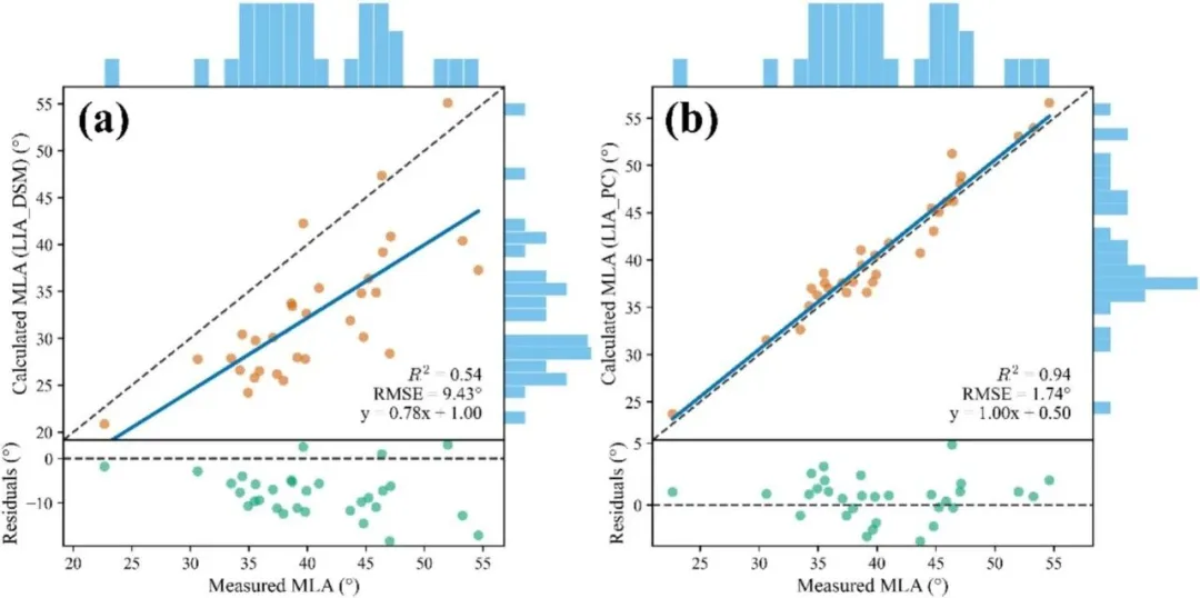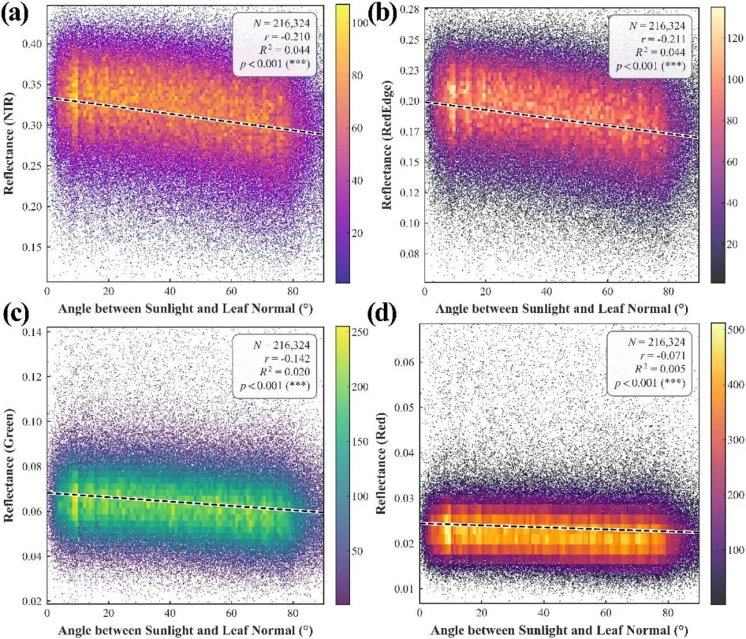 结果表明,基于三维点云直接分析的LIA_PC方法具有较高精度,其决定系数(R²)为0.94,均方根误差(RMSE)为1.74°(以实测数据为参照);相比之下,LIA_DSM方法虽然计算效率更高,但精度较低(R² = 0.54,RMSE = 9.43°)。此外,本研究进一步验证了结构性状的功能意义,发现叶片取向是影响叶尺度表观反射率的重要因素,尤其对近红外(NIR)和红边(RedEdge)波段具有显著影响。