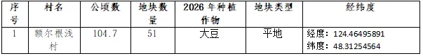 项目区位于莫力达瓦达斡尔族自治旗汉古尔河镇额尔根浅村,有104.7公顷旱田合作种植。具体土地情况为:旱田104.7公顷,地块分布在1个自然村,涉及地块数量为51块。(详见附件)