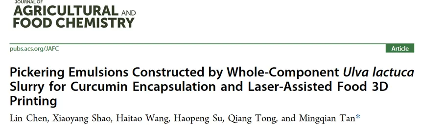 Chen L, Shao X, Wang H, et al. Pickering Emulsions Constructed by Whole-Component Ulva lactuca Slurry for Curcumin Encapsulation and Laser-Assisted Food 3D Printing[J]. Journal of Agricultural and Food Chemistry, 2026.
