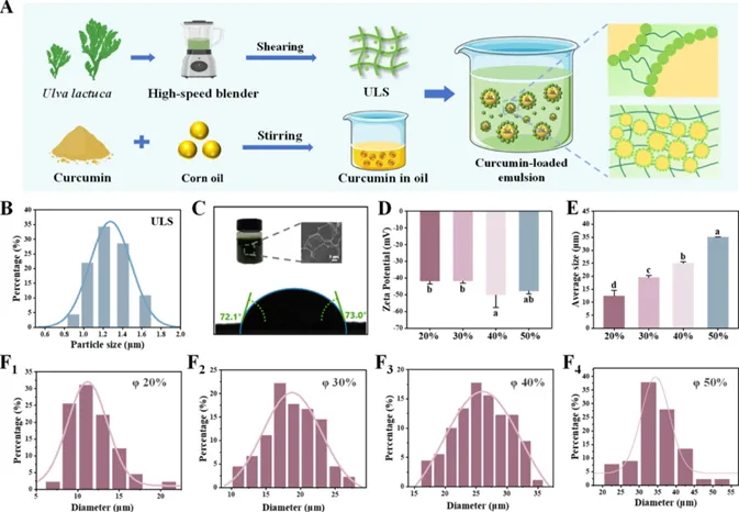 Fig. 1. (A) Schematic diagram of the preparation of curcumin-loaded UPEs. Characterization of Ulva lactuca slurry (ULS): (B) particle size distribution and (C) three-phase contact angle (θ), visual appearance, and cryo-SEM images. Properties characterization of the UPEs with oil phases of 20%, 30%, 40%, and 50% (v/v), respectively, (D) zeta potential, and (E) average particle diameter and (F1–F4) droplet size distribution. Different letters indicate significant differences between different samples (P < 0.05).