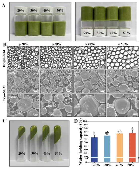 图2. 分别用20%、30%、40%和50%(v/v)玉米油制备的UPEs的(A)视觉外观、(B)显微镜图像(明场和cryo-SEM)、(C)离心稳定性以及(D)持水力