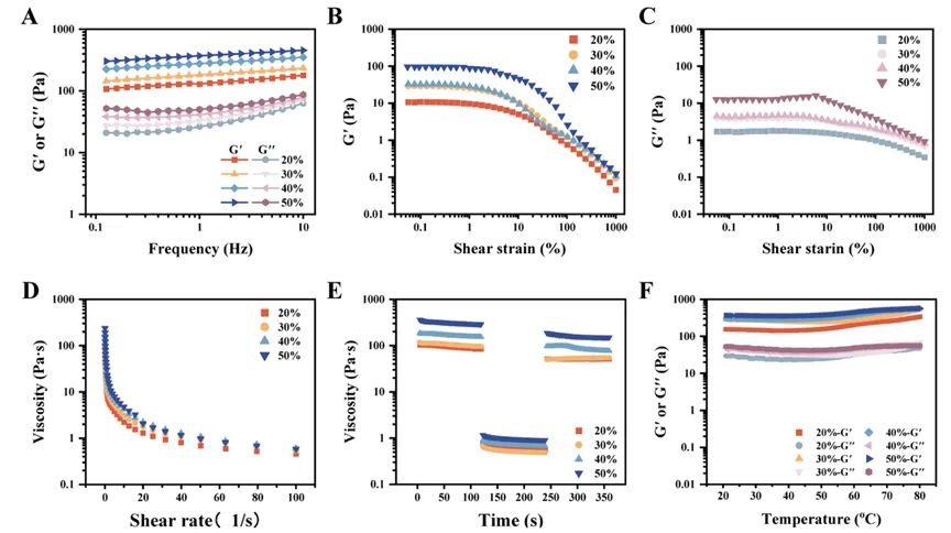 图3. 分别用20%、30%、40%和50%(v/v)玉米油制备的UPEs的流变学性能。(A) 频率扫描;(B, C) 应变振幅扫描(储能模量G′和损耗模量G″);(D) 剪切速率扫描;(E) 蠕变恢复测试;(F) 动态温度扫描测试