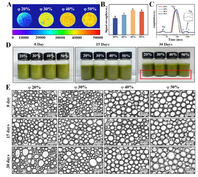 Fig. 4. Intermolecular dynamics of UPEs prepared with 20%, 30%, 40%, and 50% corn oil by volume, respectively. (A) Magnetic resonance image and (B) relative intensities of the signals, (C) T2 relaxation time distribution curves. (D) Appearance and (E) optical microscopy images of UPEs after storage at 4 °C for 0, 15, and 30 days. Different letters indicate significant differences between different samples (P < 0.05).