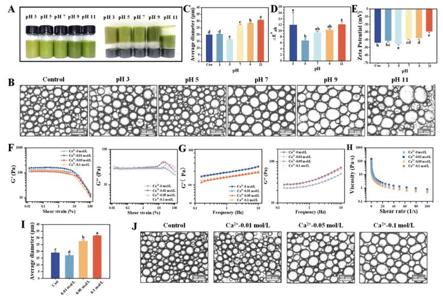Fig. 5. Characterization of UPEs synthesized under pH of 3, 5, 7, 9 and 11, respectively. (A) Macroscopic appearance, (B) optical microscope images, (C) average particle diameter, (D) chromatic aberration analysis, and (E) zeta potential measurement. Rheological properties including (F) strain amplitude sweep, (G) frequency sweep, and (H) shear rate dependence, along with (I) mean particle size distribution and (J) optical micrographs of UPEs fabricated with Ca2+ concentrations of 0.01, 0.05, and 0.1 mol/L. Statistical significance (p < 0.05) between experimental groups is denoted by distinct alphabetical superscripts.