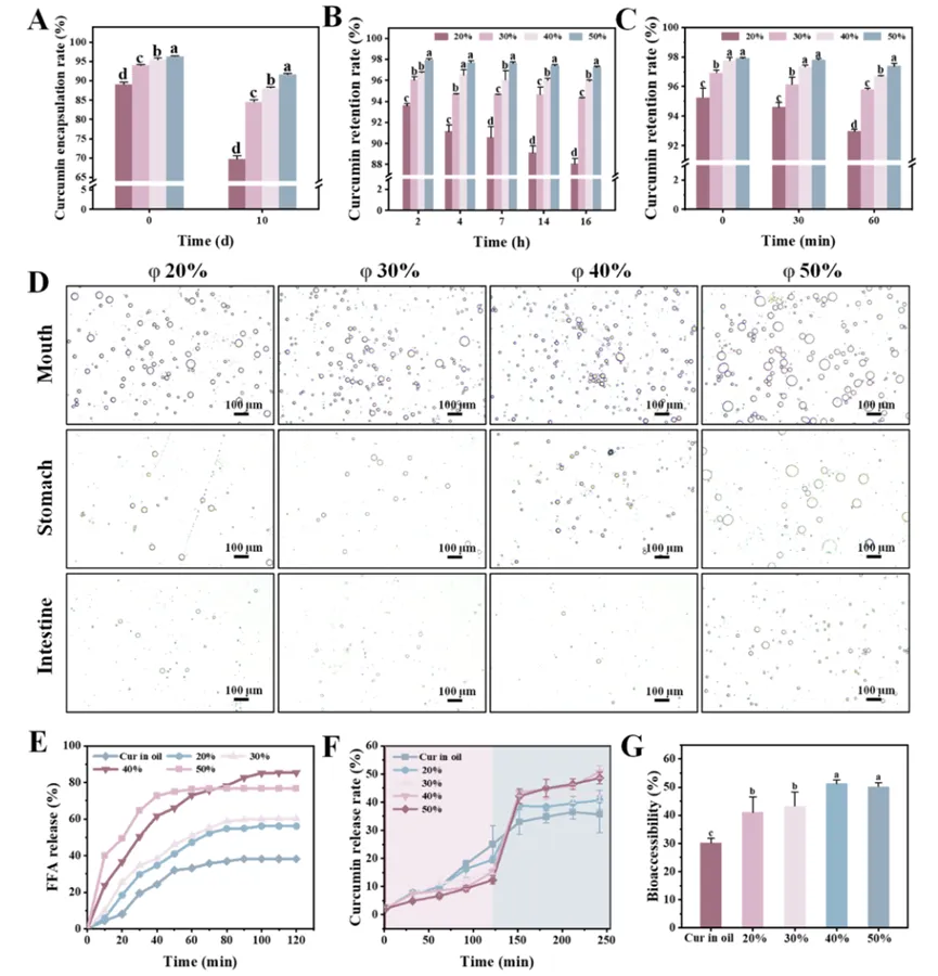 Fig. 6. Curcumin retention in UPEs (20–50% corn oil, v/v) under various conditions: (A) ambient storage (25 °C/light, 10 d), (B) UV–B laser exposure (16 h), and (C) thermal treatment (90 °C, 60 min). (D) Optical images, (E) free fatty acid release profiles, (F) curcumin release pattern, and (G) curcumin bioaccessibility of in vitro simulated digestion patterns for UPEs formulated with 20–50% (vol) corn oil stabilization, contrasted against curcumin dispersions in pure corn oil matrices. Letters indicate statistical significance between experimental groups (P < 0.05).