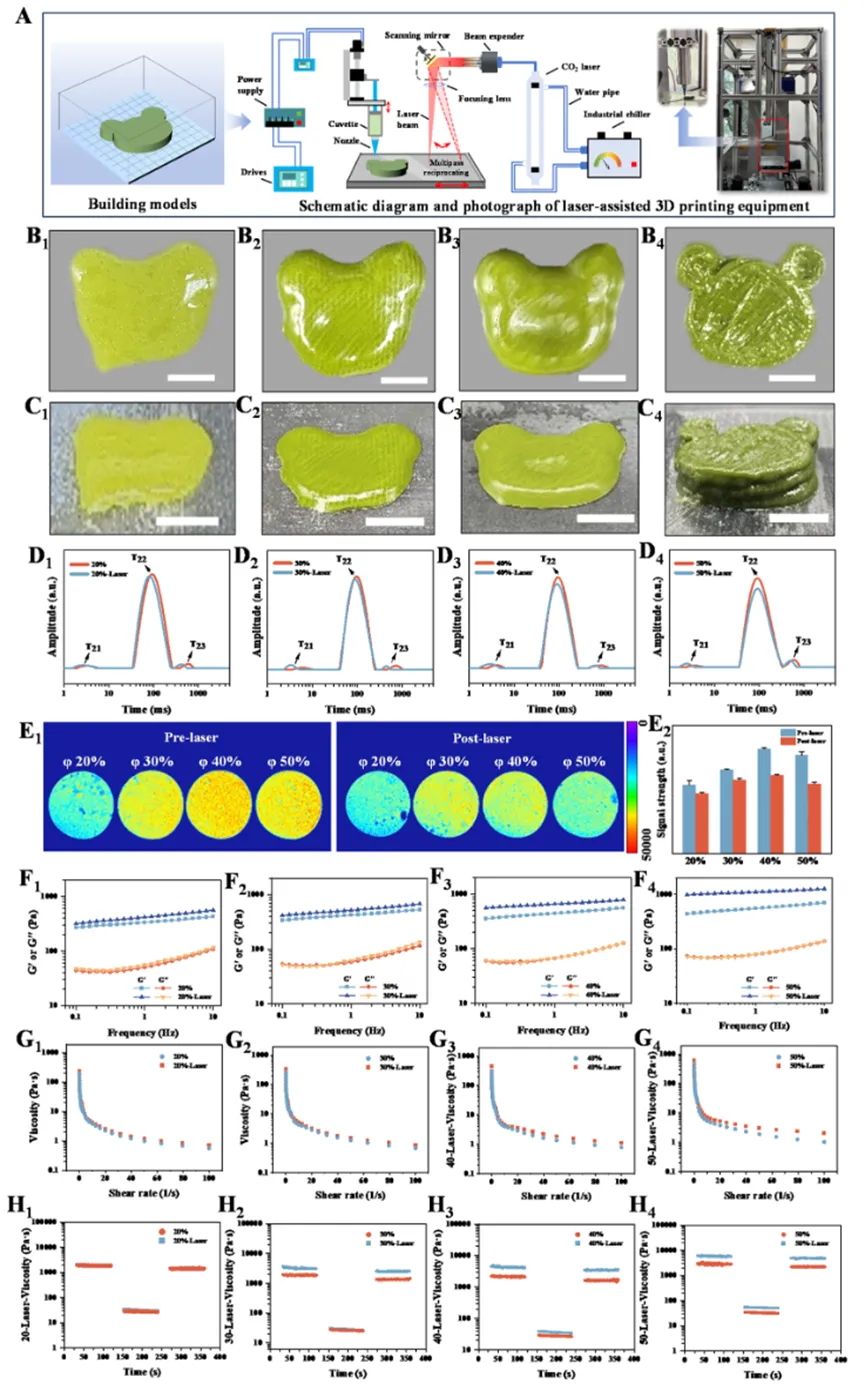 Fig. 7. (A) Predesigned printing model, schematic diagram and photograph of a laser 3D printer’s mechanical architecture. (B1–C4) Printed photographs of laser-assisted 3D printing curcumin-loaded UPEs prepared with corn oil at 20%, 30%, 40% and 50% (v/v), respectively, including top and front views. The scale bar is 1 cm. (D1–D4) Comparative T2 relaxation time distributions and (E1–E2) MRI of curcumin-loaded UPEs incorporating 20%, 30%, 40%, and 50% (v/v) corn oil concentrations pre- and postextrusion printing. Rheological properties for curcumin-loaded UPEs formulated with corn oil at 20%, 30%, 40% and 50% (v/v) pre- and postextrusion printing. (F1–F4) Frequency sweep (storage modulus: G′ and loss modulus: G″), (G1–G4) shear rates sweep, and (H1–H4) thixotropic recovery tests.