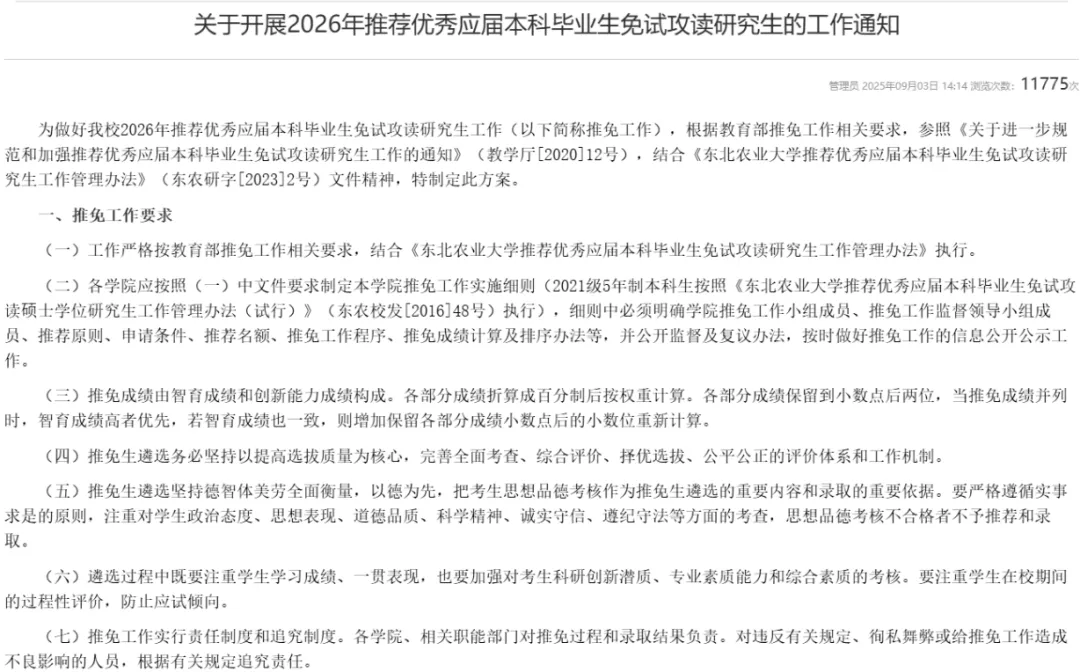 (七)对有特殊学术专长或具有突出培养潜质者,综合素质测评成绩(按学生工作部下达成绩执行)须进入本专业前50%,且有3 名 以上本校本专业教授联名推荐。