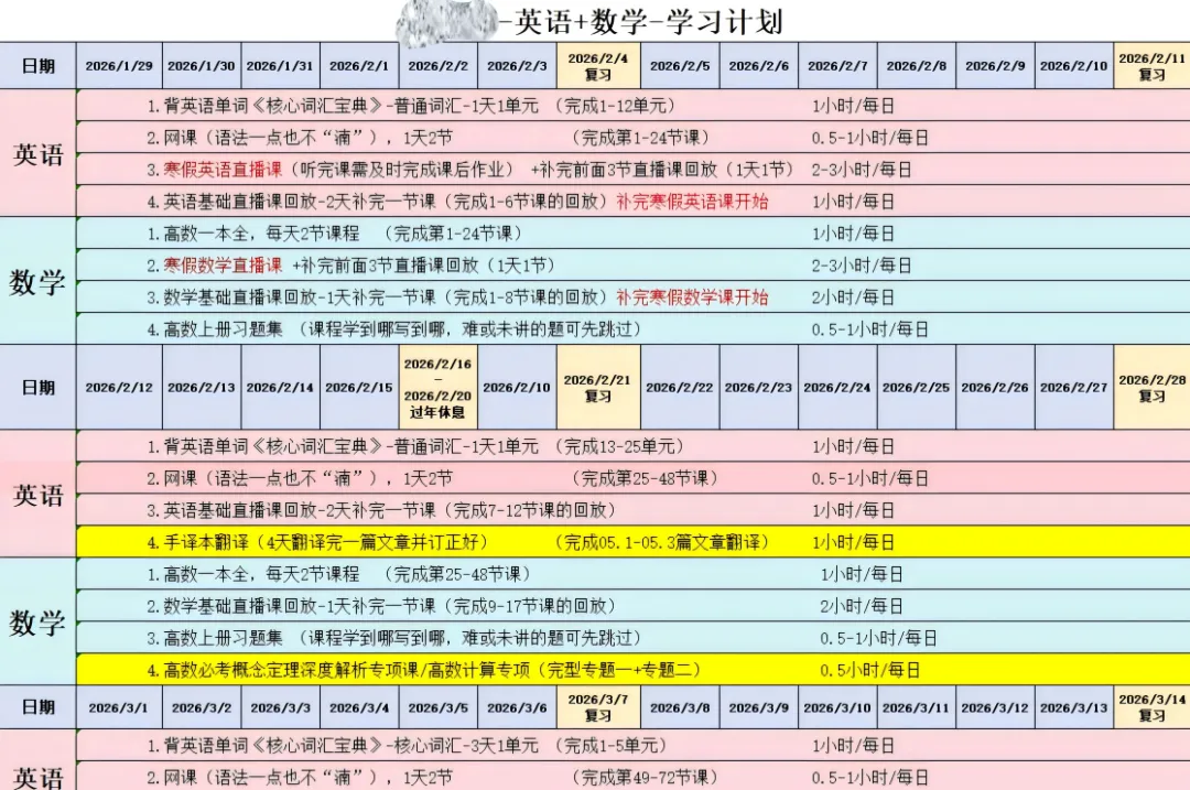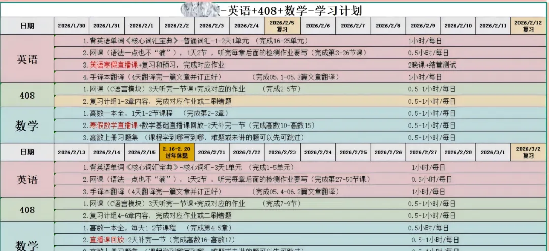 计划一方面是学习计划。不管是自学还是报班学习,考研备考想要保持高效率的学习,都一定要提前制定好合适的复习计划。不同阶段不同科目的学习重点、复习方向、学习方法。