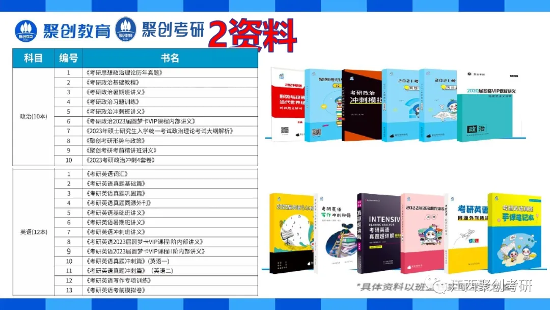 选择好的辅导资料等于考研迈出了一大步。我们会为江西聚创考研全日制二战集训营学员提供公共课和专业课资料。