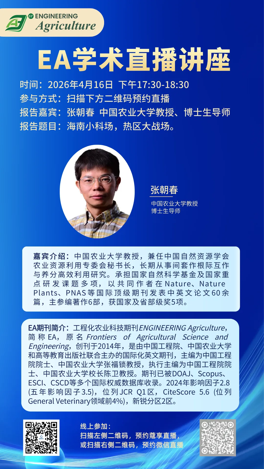 工程化农业科技期刊ENGINEERING Agriculture,简称EA,原名Frontiers of Agricultural Science and Engineering,创刊于2014年,是由中国工程院、中国农业大学和高等教育出版社联合主办的国际化英文期刊,主编为中国工程院院士、中国农业大学张福锁教授,执行主编为中国工程院院士、中国农业大学校长陈卫教授。期刊已被DOAJ、Scopus、ESCI、CSCD等多个国际权威数据库收录。2024年影响因子2.8 (五年影响因子3.5),位列JCR Q1区,CiteScore 5.6 (位列General Veterinary领域前4%),新锐分区2区。作为一本致力于通过工程化思维推动全球农业现代化转型的期刊,EA不仅表达农业的科学探索与技术创新,更强调如何将科学与技术转化为解决现实的工程化方案,实现农业的变革与进步。http://journal.hep.com.cn/fase●投稿链接 (Contribution Link)https://mc.manuscriptcentral.com/faseReview article, Research article, News & Views, Comments, Perspective, etc. 编辑:石靓