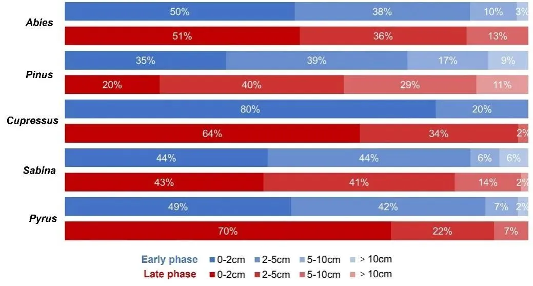 此外,研究者还对梨属木炭进行了重点分析。结果显示,与早期阶段相比,晚期的梨属木材更多表现为细小枝条,而不是粗大枝干(图3)。这一现象可能与果树资源管理有关,例如减少砍伐、通过主动修剪利用小枝条等方式维持果树生长和果实供给。果树管理通常意味着更长期、稳定的土地经营活动,也往往以较高程度的定居生活为前提。因此,孔龙村晚期人群对果木资源的利用,不仅反映了木材需求结构的变化,也可能暗示其农业活动及定居强度进一步强化。