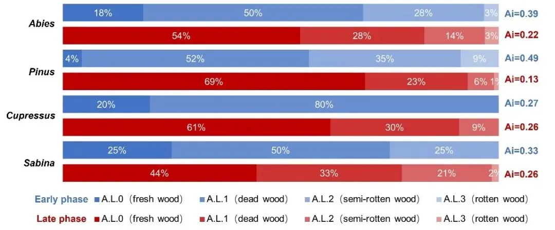 图5 早晚期木炭腐烂程度及腐烂指数指数