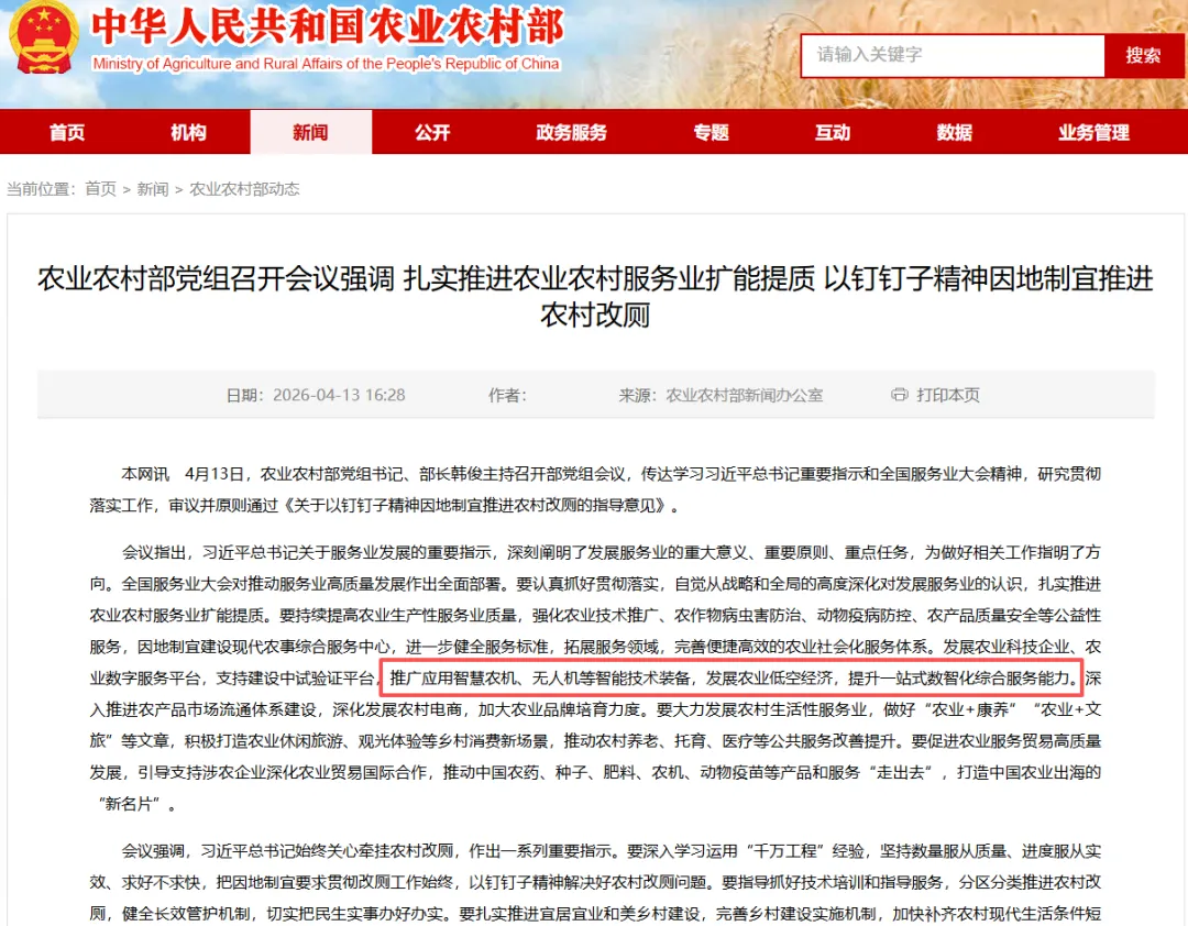 4月13日,农业农村部召开党组会议。会议指出,要发展农业科技企业、农业数字服务平台,支持建设中试验证平台,推广应用智慧农机、无人机等智能技术装备,发展农业低空经济,提升一站式数智化综合服务能力。