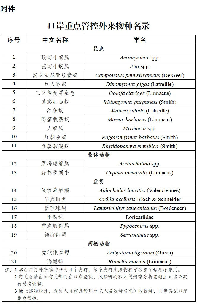 根据《中华人民共和国生物安全法》和《外来入侵物种管理办法》,海关总署会同农业农村部、自然资源部、生态环境部、住房城乡建设部、国家林草局组织制定了《口岸重点管控外来物种名录》(见附件),现予以发布,自2026年5月1日起施行。