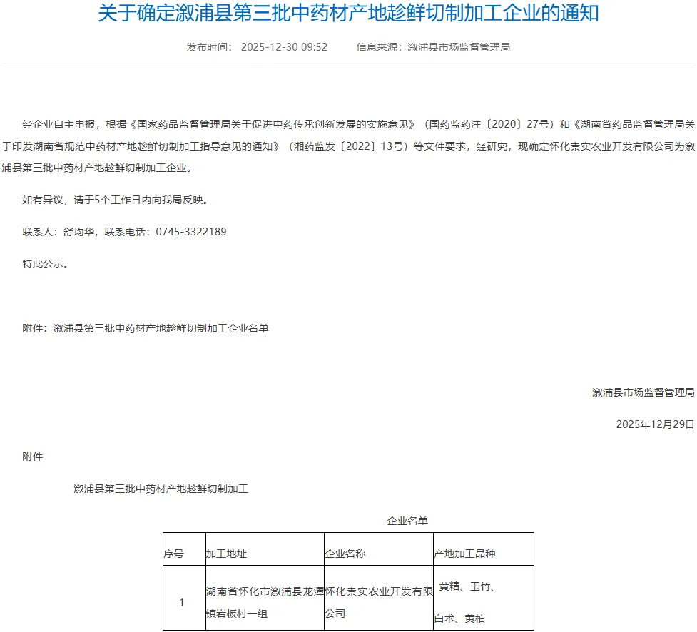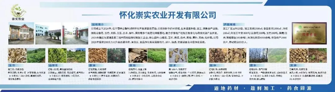 怀化崇实农业开发有限公司坐落于湖南省怀化市溆浦县龙潭镇,是一家专注于中药材产地趁鲜切制加工的专业企业。2025年12月,经溆浦县市场监督管理局审核批准,怀化崇实农业开发有限公司正式被确定为溆浦县第三批中药材产地趁鲜切制加工企业,产地加工品种涵盖黄精、玉竹、白术、黄柏等道地药材。
