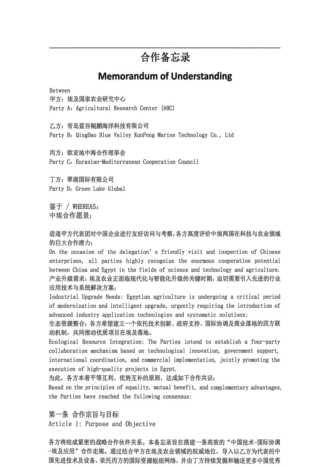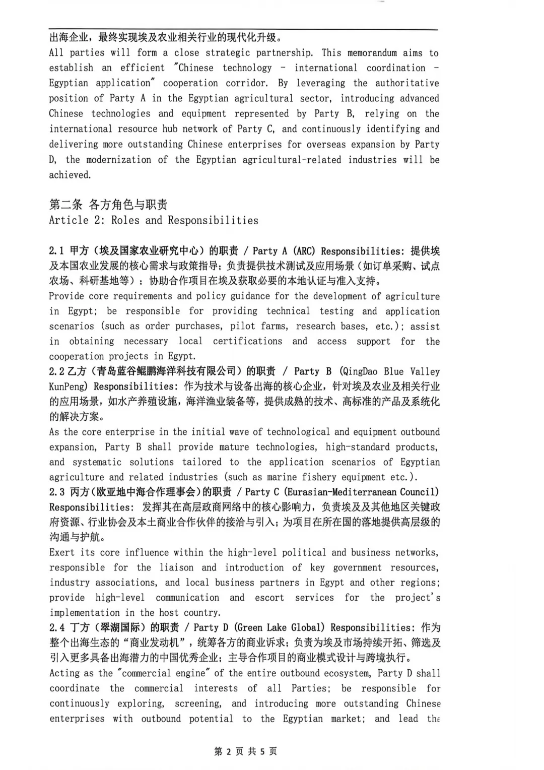 2026 年 4 月 14 日,青岛蓝谷鲲鹏海洋科技有限公司(青岛市智慧渔业专家工作站、山东青岛智慧渔业装备科技小院、青岛市科技特派员)与埃及国家农业研究中心在北京正式签署合作备忘录,欧亚地中海合作理事会、翠湖国际有限公司共同参与合作。埃及国家农业研究中心阿德尔・阿卜杜勒・阿赫达尔主席、纳萨特・优素福・瓦西夫国际高级顾问、艾琳・皮书蒂全球战略顾问,青岛蓝谷鲲鹏海洋科技有限公司向坤总经理出席签约仪式,国安达股份有限公司、天基宇航(厦门)科技发展有限公司、厦门华最灌溉设备科技有限公司、中科星图股份有限公司代表共同见证,开启中国智慧渔业装备与技术落地埃及的新征程!