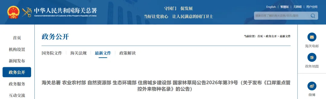 根据《中华人民共和国生物安全法》和《外来入侵物种管理办法》,海关总署会同农业农村部、自然资源部、生态环境部、住房城乡建设部、国家林草局组织制定了《口岸重点管控外来物种名录》(见附件),现予以发布,自2026年5月1日起施行。
