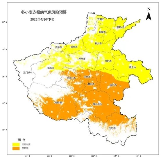 河南省农业农村厅、河南省气象局2026年4月13日联合发布小麦赤霉病气象风险预警:目前我省大部小麦处于拔节孕穗期,豫南、豫中部分地区进入抽穗期,豫南个别地块已开花。预计4月中下旬我省将出现多轮降水过程,与小麦抽穗扬花期重叠度高,全省大部特别是黄河以南地区存在小麦赤霉病发生流行气象风险,信阳、南阳、驻马店、周口、平顶山、漯河、许昌7市赤霉病发生流行气象风险高,需重点加强防范。
