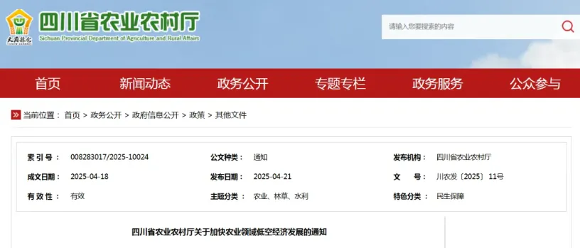 《四川省农业农村厅关于加快农业领域低空经济发展的通知》明确核心目标:推动低空经济与农业深度融合,到2027年,农业农村领域低空经济新基建、新应用、新格局基本形成,区域农机社会化服务中心实现农用无人机配置全覆盖。届时,全省农用无人机保有量将达15000台以上,新培育持证飞手5000人以上,打造5类“农用无人机+”应用场景,年度作业面积突破1亿亩次。