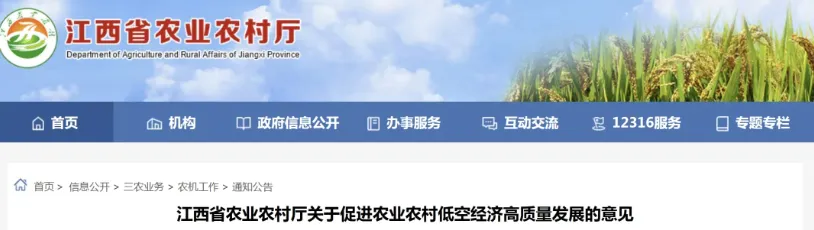 《江西省农业农村厅关于促进农业农村低空经济高质量发展的意见》提出,通过构建“低空经济+生产作业、精准监测、服务应用、新型消费、乡村治理”五大场景,推动无人驾驶航空器在农业农村广泛应用。