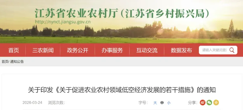 《江苏省农业农村厅关于促进农业农村领域低空经济发展的若干措施》围绕六大方面提出18条政策,明确到2030年,全省农用无人机稳定在4万台以上,作业覆盖率达50%以上,助力科技农业、绿色农业发展,释放农业新质生产力动能。