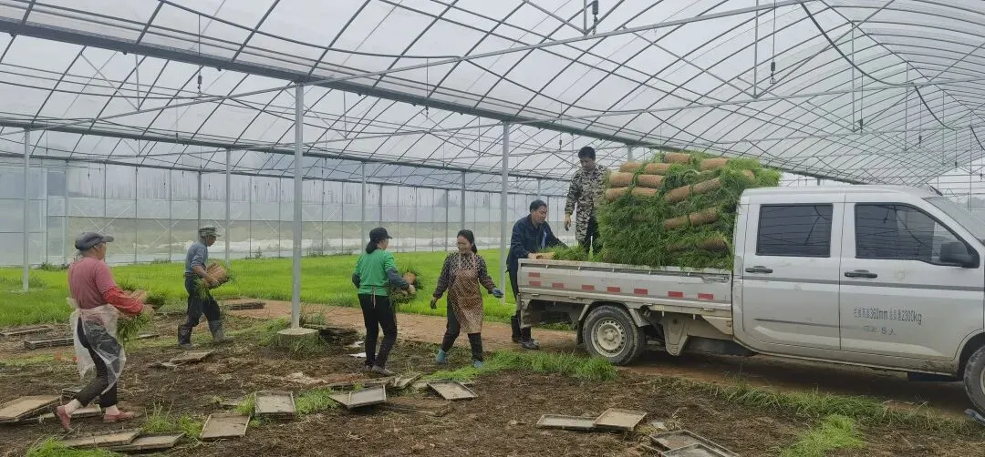 将育好的秧苗起盘装车运送出去,