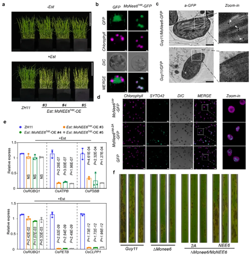 该研究鉴定出一个名为 MoNee6 的关键效应蛋白(可理解为病菌的“特制导弹”)。在侵染后期,MoNee6蛋白大量产生,侵入水稻细胞后,能够精准导航至叶绿体(图1b, c)。随后,它发挥其核酸酶(可理解为“分子剪刀”)活性,直接切割并降解叶绿体内部的DNA(图1d),导致叶绿体的基因表达被全面“熄火”(图1e)。这相当于切断了细胞的“能源总部”和“防御指令中心”,最终导致水稻细胞死亡(图1a),为病菌的扩展扫清了障碍(图1f)。