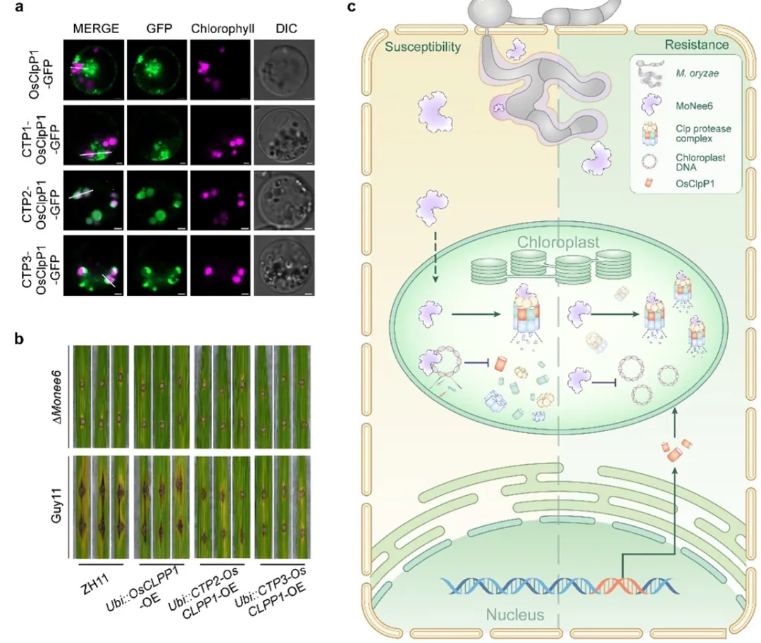 研究进一步揭示了水稻与病菌之间精妙的“攻防博弈”。水稻并非坐以待毙,其叶绿体内的 Clp蛋白酶复合体(可视为细胞的“质检与回收站”)能够识别并降解入侵的MoNee6蛋白,构成一道防线。然而,狡猾的病菌展开了“反制”:MoNee6蛋白会反向抑制叶绿体自身编码的一个关键组分 OsCLPP1 的表达,从而削弱整个Clp蛋白酶的“质检”能力,成功突破防御。