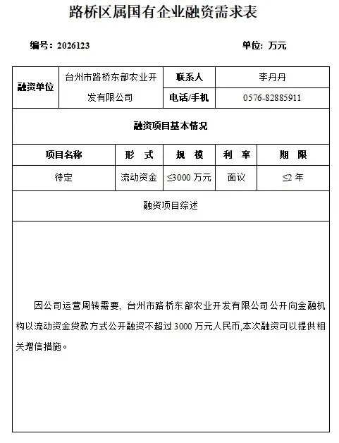 >台州市路桥东部农业开发有限公司发布融资需求
